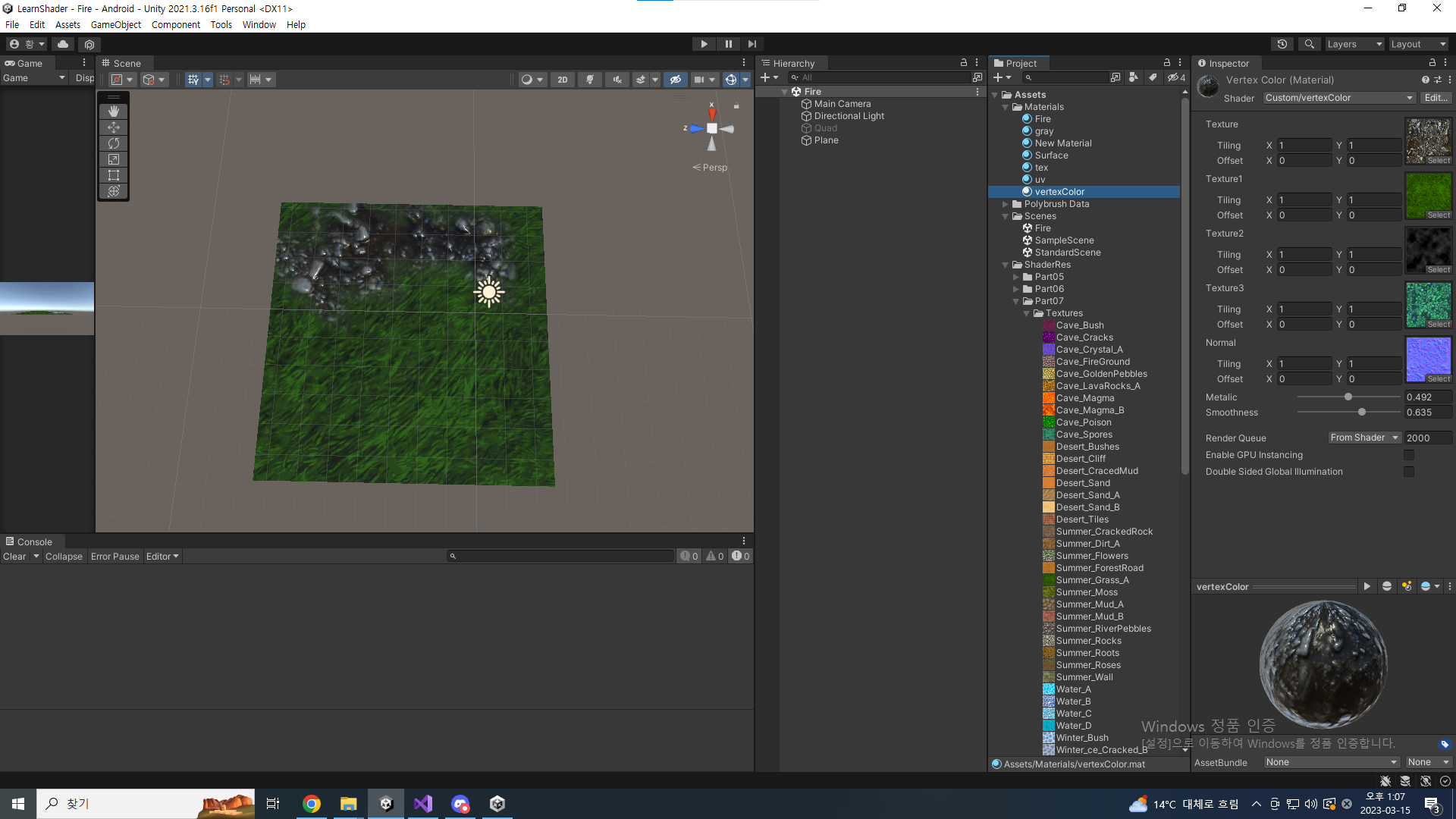 비에 젖은 느낌 내보기 Shader "Custom/vertexColor" { Properties { _MainTex("Texture",2D) = "white"{} _MainTex1("Texture1",2D) = "white"{} _MainTex2("Texture2",2D) = "white"{} _MainTex3("Texture3",2D) = "white"{} _BumpMap("Normal",2D) = "white"{} _Metallic("Metalic",Range(0,1)) = 0 _Smoothness("Smoothness",Range(0,1)) = 0 } SubShader { Tags { "RenderType" = "Opaque" } CGPROGRAM #pragma surface surf Standar..